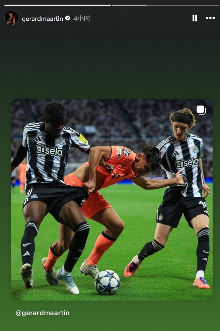 本場(chǎng)比賽巴薩球員馬丁首發(fā)出戰,他也在個(gè)人社媒曬出本場(chǎng)與戈登、伊蘭加兩名紐卡前鋒對抗的照片。