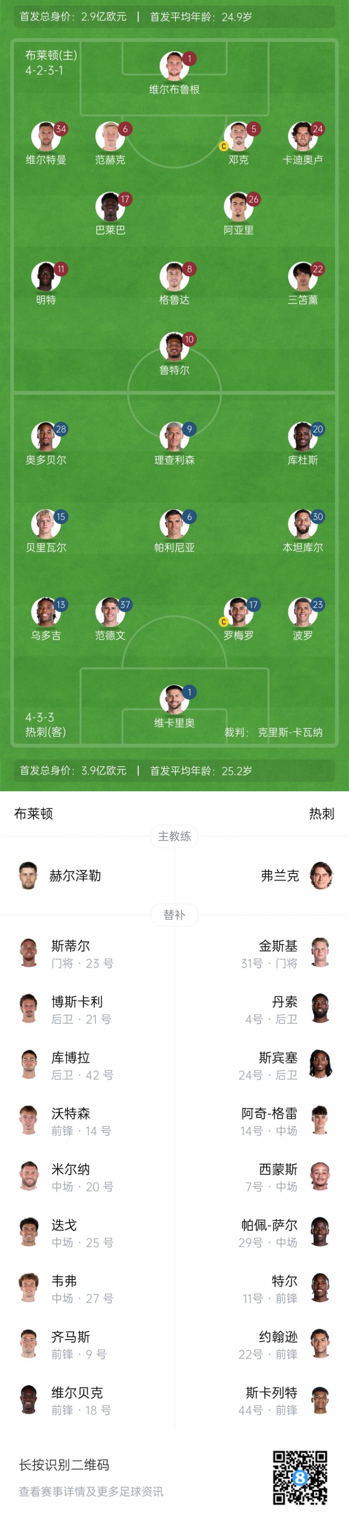 布萊頓替補:23-斯蒂爾、21-博斯卡利、42-庫博拉、20-米爾納、25-迭戈-戈麥斯、27-韋弗、9-齊馬斯、14-沃特森、18-維爾貝克