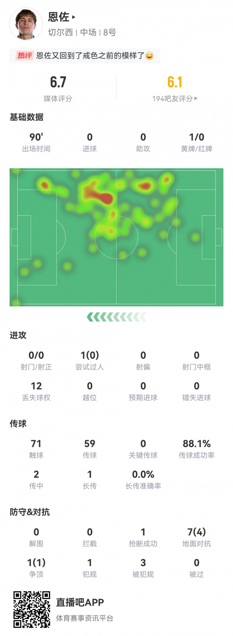 9月21日訊 本輪英超曼聯(lián)2-1切爾西。此役恩佐首發(fā)打滿(mǎn)全場(chǎng),球員全場(chǎng)重點(diǎn)數據如下↓