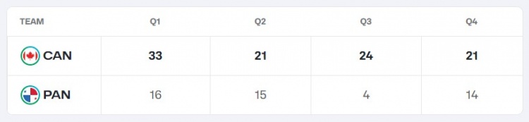 本場(chǎng)比賽,加拿大男籃首節就領(lǐng)先17分,第三節還打出單節24比4。