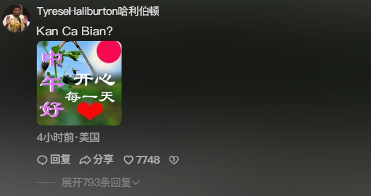 步行者球員哈利伯頓在評論區用拼音回復:“Kan Ca Bian?”