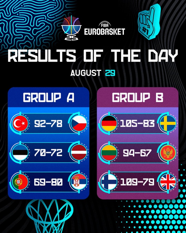 08月30日訊 男籃歐錦賽第三日六場(chǎng)比賽全部結束。賽果如下: