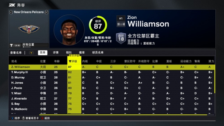 2K26鵜鶘能力值:錫安87&普爾80 德章泰-穆雷&赫伯特-瓊斯均為81