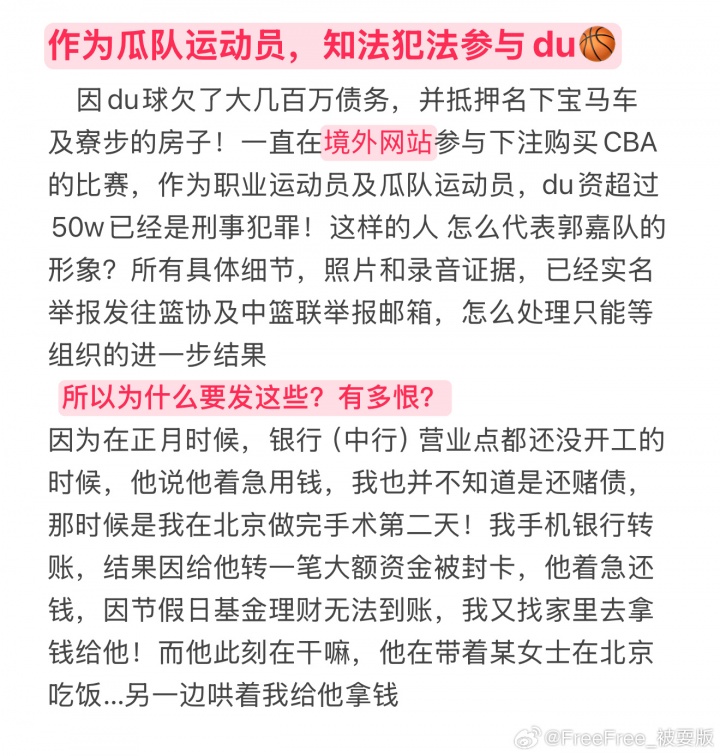 9日晚19點(diǎn),“@FreeFree_被耍版”再次發(fā)出相關(guān)記錄舉報徐杰疑似參與賭球,爆料其一直在境外網(wǎng)站參與下注購買(mǎi)CBA的比賽,并因此欠下大幾百萬(wàn)債務(wù),同時(shí)還抵押了名下的寶馬車(chē)及房子。并且已將證據發(fā)往籃協(xié)進(jìn)行實(shí)名舉報。