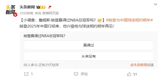 今日,頭條新聞官微發(fā)布小調查,話(huà)題是:詹姆斯-哈登贏(yíng)得過(guò)NBA總冠軍嗎?