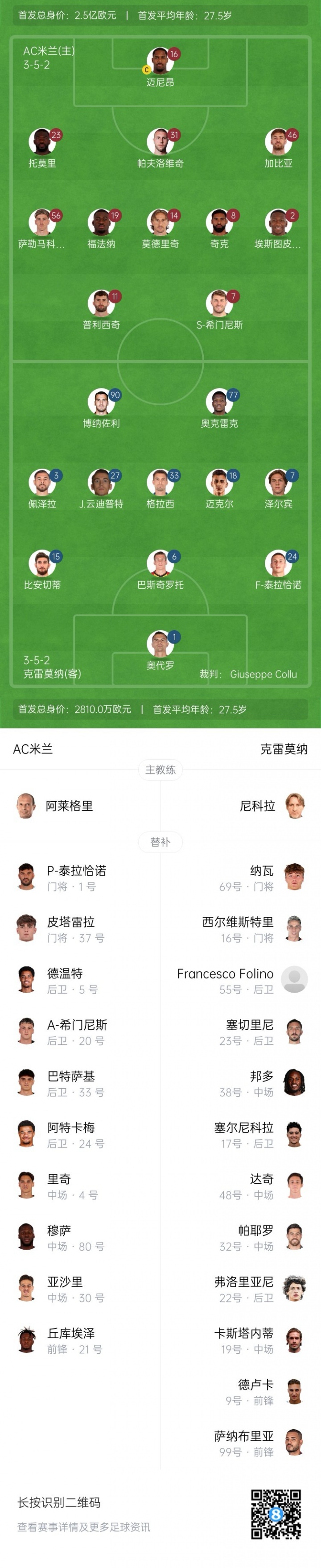 米蘭首發(fā):16-邁尼昂、23-托莫里、46-加比亞、31-帕夫洛維奇、2-埃斯圖皮尼安、8-奇克、14-莫德里奇、19-福法納、56-薩勒馬科爾斯、7-S-希門(mén)尼斯、11-普利西奇