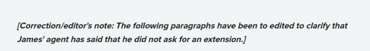 該記者隨后在文章中寫(xiě)上更正/注釋?zhuān)唧w為:“本文內容已經(jīng)修改,詹姆斯的經(jīng)紀人說(shuō)過(guò),他沒(méi)有向湖人要求提前續約?!?/span>
