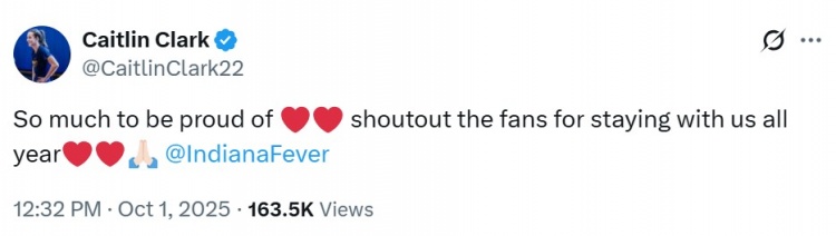賽后,因傷賽季報銷(xiāo)的狂熱球星凱特琳-克拉克更推鼓勵球隊,她寫(xiě)道:“滿(mǎn)滿(mǎn)的驕傲 ???? 感謝球迷們一年來(lái)的陪伴與支持 ???????? @印第安納狂熱!”