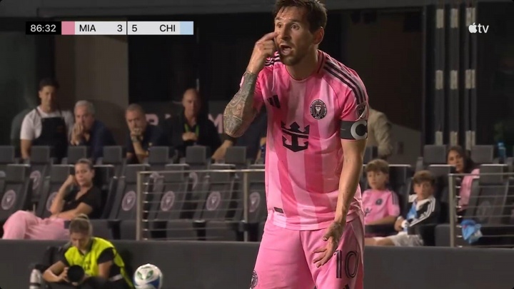 比賽第87分鐘,邁阿密?chē)H獲得前場(chǎng)任意球,梅西罰任意球前與裁判因擺球位置起爭執,梅西數次調整,期間頻頻向裁判揮手,并跟裁判說(shuō)著(zhù)什么,隨后還指指自己的眼睛。