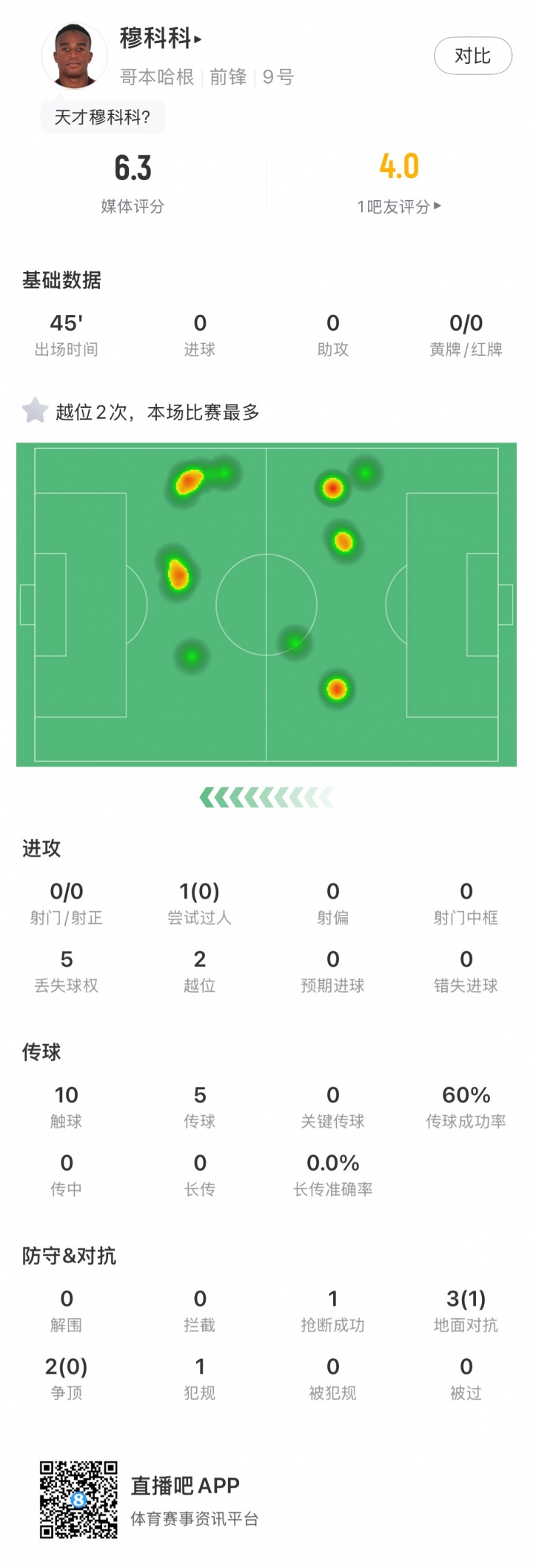 效力于哥本哈根的前鋒穆科科此役出戰半場(chǎng)便被換下。半場(chǎng)無(wú)射門(mén)越位兩次,10次觸球,5次傳球,5次丟失球權,傳球成功率60%。